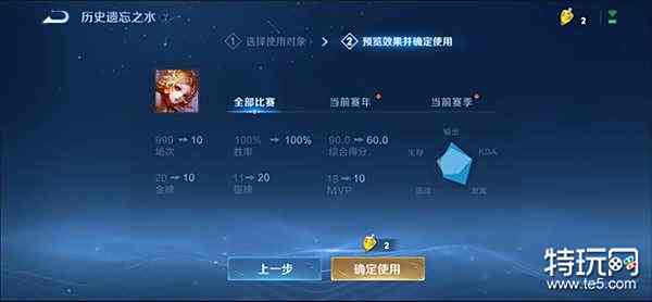 1、遗忘之水(历史):使用后会遗忘选择英雄的过往的早期历史数据(保留本赛年及上赛年),重复对同一英雄使用道具消耗会增加。