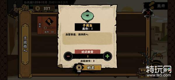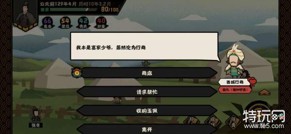 与西域商人交谈接取任务,将收购玉佩的任务完成,增加与西域行商的好感,此时好感达到五十,没必要花钱增加好感了。这时候商店全部商品九折(满好感七折)