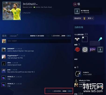 内马尔不止是一位知名球星,也是一个CSGO狂热爱好者。经常通宵打CSGO,最爱的战队是巴西的本土FURIA!我们话不多说,直接来看看马儿的库存。内马尔的个人主页,有2900页的主页留言,堪比中等CSGO明星职业哥的热度了。