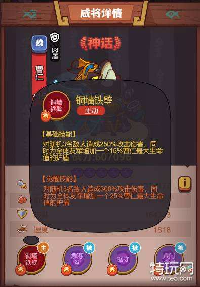 实战分析:看一下主力咸将曹仁的技能,对随机3名敌人造成250%攻击伤害,同时为全体友军增加一个15%曹仁最天生命值的护盾,再加上曹仁本身的肉盾属性,是一个非常抗揍的位置。这就从另一方面提升了队伍的坦度。