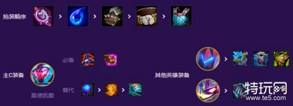 装备分析:铁男推荐暴力法强装,所以用帽子和法爆是最好,蕾欧娜前排当肉,离子能够削弱敌方魔抗,铁男输出更好,稻草人打辅助伤害。