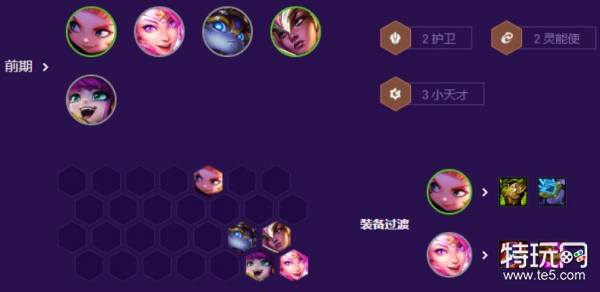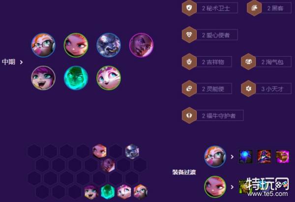 前期靠天湖法系度过,小天才在前期看还是非常不错,补充2护卫2灵,中期换佐伊打工,推荐阵容2护卫+2灵能使+3小天才