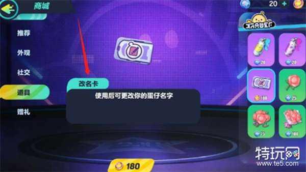 3、我们在道具页面中找到改名卡然后购买就可以改名了。(改名卡售价180金币=18块钱人民币)