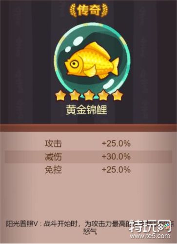 黄金锦鲤:攻击25%,减伤30%,免控25%。开局为攻击最高的友军加50点怒气。(补充说明,这个开局加的50怒气可以抵消蚀骨开局减怒50)锦鲤的争议比较少,最关键的就是这个开局加50怒了。可以称得上最强辅助鱼。减伤和免控属性,也比较适合辅助类武将提高存活几率。