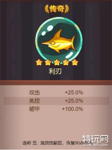 利刃:攻击25% 免控25% 破甲100% 释放技能后恢复50点怒气。目前最强输出鱼。