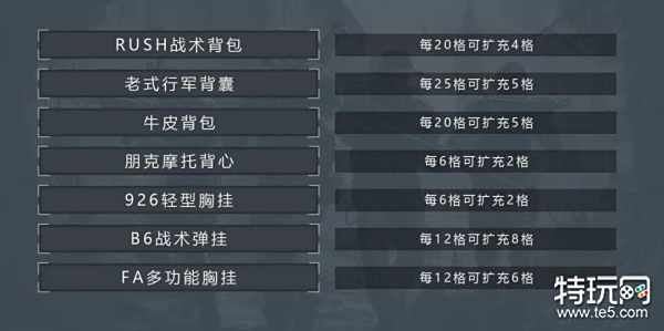首先使用老式行军包,里面套一个牛皮背包和926轻型弹挂,还能剩余4格空间,牛皮背包里套RUSH战术包,可剩余5格空间,RUSH战术包里套2个B6战术胸挂。总共可用空间为4+8+5+20+20=57格,相较扩充前的30格共扩容27格。