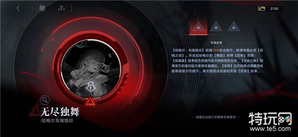 专属效果:攻击+20%。新增专属必杀【悲悯之伐】。开启后哈梅尔的舞蹈获得【逆转】效果:【安魂曲】效果变为范围内敌方持续损失生命,【生命之触】效果变为范围内敌方承受伤害增加。【逆转】后的效果会随着原技能等级提升而提升。再次使用该技能时关闭【逆转】效果。