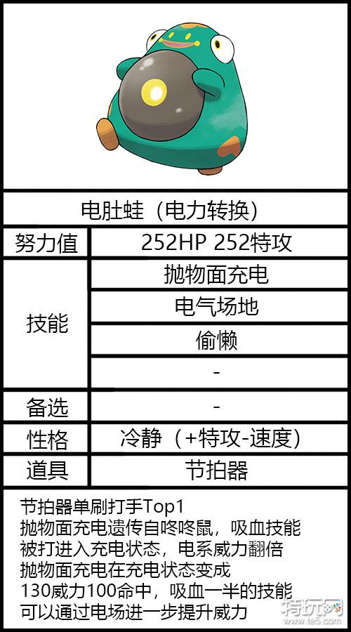 奇树的大酱!节拍器打手Top1,原本在pvp中显得非常鸡肋的特性在打坑中却非常好用,和节拍器一样,是鸡肋道具+鸡肋特性翻身的典范!抛物面充电原本仅仅是65威力的吸血技能,但由于电肚蛙速度慢,几乎每回合都是后手,配合特性充电,让抛物面充电变成了130威力100命中,恢复伤害50%血量的神技。