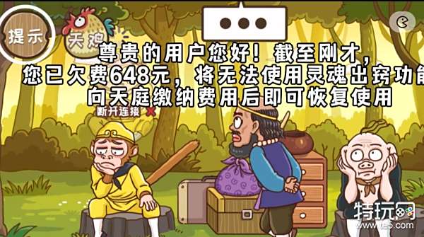 2、把出窍的悟空灵魂往上拉,此时因为欠费648元无法使用灵魂出窍功能,需要我们将欠费补齐。