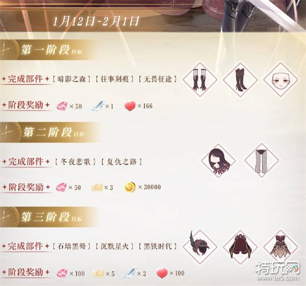 1:在1月12日更新之后到2月1日,新春制衣活动会指引套装冰风战歌染色款,集齐可以获得钻石200,水晶鞋三个,公主级刷新卡八张,体力266,金币30000奖励;
