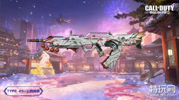 Type 25-公鸡报晓采用白色涂装,握把上方的雄鸡气宇轩昂,宣告着晨辉的降临!枪托处采用了公鸡尾羽造型,枪口处悬挂的灯笼展现出春节的氛围。