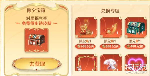 这个条件是相当的简单了,就是除夕当日完成一场对局即可,这个对局可以是5V5的匹配、排位、巅峰都是可以的。完成后就可以直接可以领取一个福气签了。解签就必得史诗皮肤自选宝箱了。这里面可是有10款史诗皮肤的,包含很热门的吕布的末日机甲、孙策的猫狗日记、小乔的缤纷独角兽、安琪拉的心灵骇客。