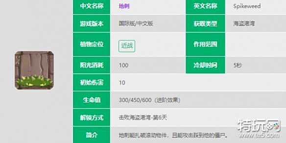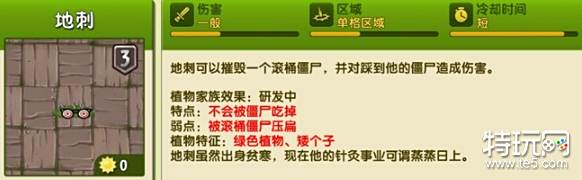 1.地刺(Spikeweed)是《植物大战僵尸2》只能种植在地面上的植物,大多数类型的僵尸通常都会忽略他