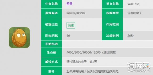 坚果,坚果可以抵御僵尸,有着高防御性,种植要50阳光,技能效果为披上铁盔甲,抵挡更多的伤害。