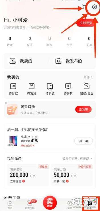 2、然后在转转主页当中找到右下角的(我的),点击右上角的设置;