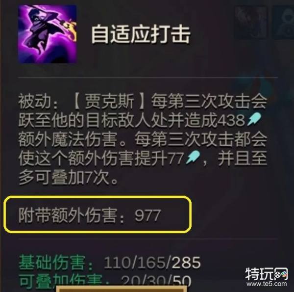 贾克斯基础技能伤害全等级提升现在3星285魔法伤害,较大增加输出能力,这还不是最关键的,贾克斯基础技能伤害现在受到法强影响,拿帽子举例增加70%法强,开局第三次的普攻触发的伤害就能达到425+85,510的魔法伤害。