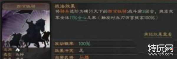 西凉铁骑:战斗前3回合,提高我军全体12.5%→25%会心几率;若马腾统领,则提高会心几率受速度影响。
