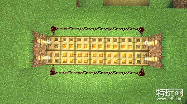 3、最后我们使用红石粉将所有的活板门连接起来,然后往活板门下面放岩浆就大功告成了。
