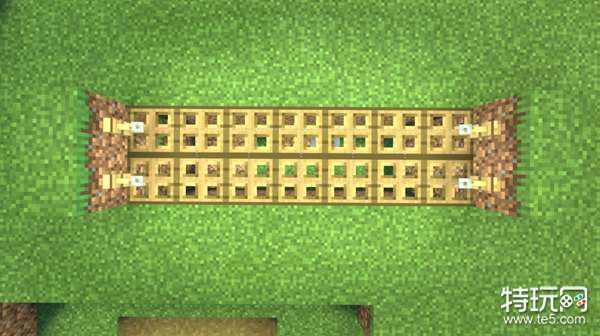 2、接着我们在两边放置草方块和绊线钩,然后在中间放上线来进行牵引。