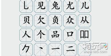 本关的可以找出二十个字为:丶、一、二、口、吅、吕、品、人、个、从、众、欠、负、儿、尤、兔、免、见、贝、乚。