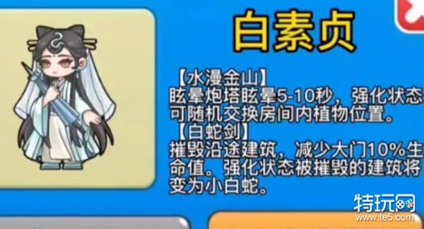 2、强化状态:使用技能,向前方释放3道剑气,摧毀沿途建筑,被摧毁的建筑将变为小白蛇,房间内炮塔优先攻击小白蛇,若剑气碰到大门,可减少大门10%生命值。