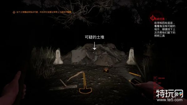 进入游戏后,玩家需要分头去学校各处找到一个工具(铁锹、铲子)最好再拿上一个手电筒,确保每人手上都拿着一个工具,在荒地可疑的土堆边集合,互动土堆,剧情过后插入香即进入正式游戏的第一阶段。
