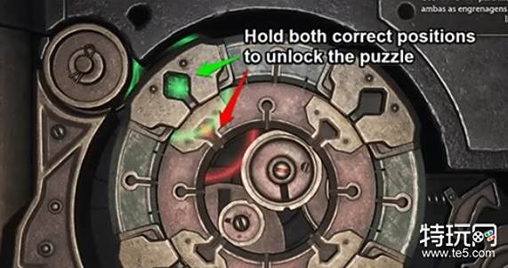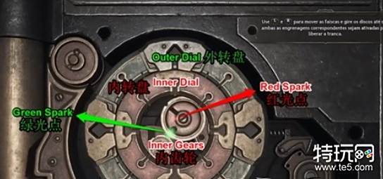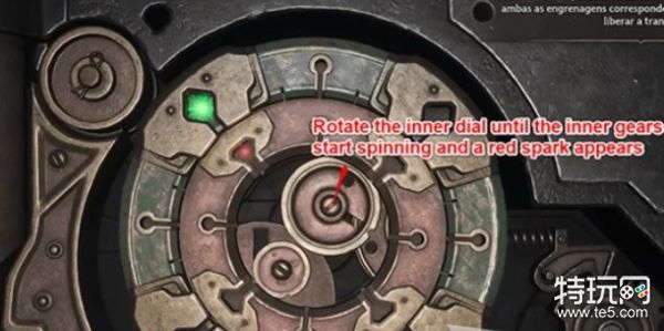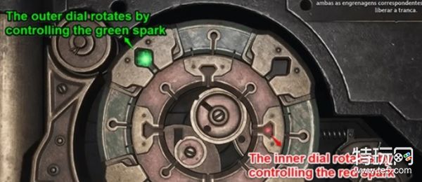 首先操作左摇杆,将绿色光点嵌入外转盘,一直旋转左摇杆转动外转盘,注意看右下角的外齿轮,当外转盘转动至正确位置时,外齿轮会发出绿色的光,这时候就不要再动左摇杆了。