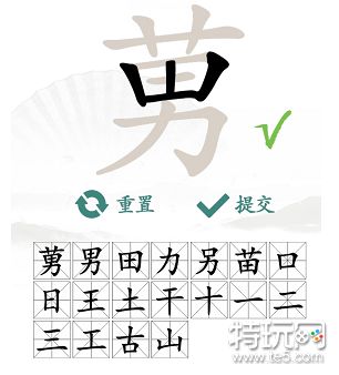 【莮、男、田、力、另、苗、口、日、王、土、干、十、一、二,三、工、古、山】