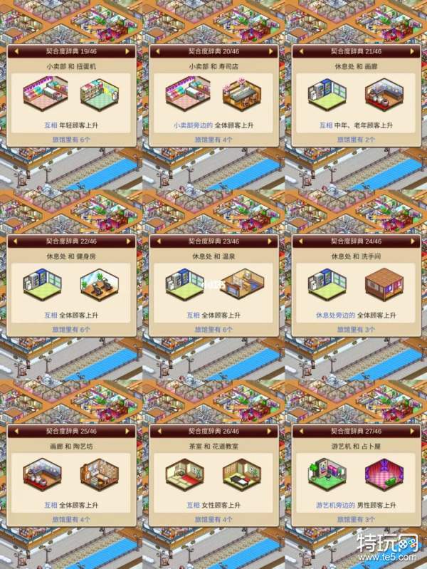 温泉物语2游戏中各种建筑都是有契合度了,将契合度高的设施建在一起会有更高的收益,今天就为大家整理了一下游戏中目前各类建筑的契合度,方便大家进行查看和建设,快来看看吧。