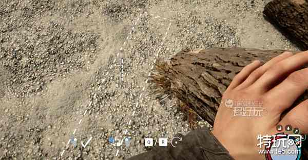 1、首先去砍伐一份圆木,捡起圆木后将视角朝向地面,当出现下图所示的这种长方形的虚线框时拿出木棍;