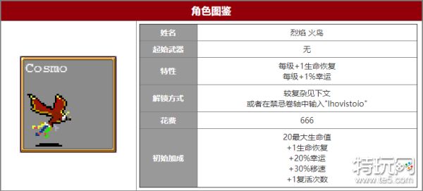 烈焰是《吸血鬼幸存者》中的一个隐藏角色,它比较特殊,虽然有带有起始武器黑白鸽子,但是这两个武器并不占用武器格子,是额外赠送的。从你10级开始,每提升5级,这两个额外武器就会提升1级,到你40级的时候,附赠的黑白鸽子达到满级状态。
