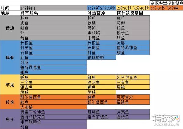 黄条:2分30秒~4分40秒保底钓到金色的鱼,有概率获得橙色或者紫色的鱼。