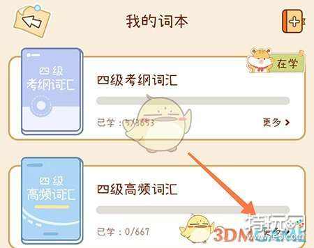 2、进入我的词本,找到想要删除词本,点击其右下角更多选项;