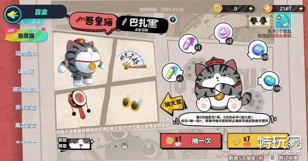 2、盲盒抽奖每6次为1轮,6次内必定会抽中大奖,大奖不会重复。玩家可以选择吾皇猫或者巴扎黑皮肤盲盒进行抽取。
