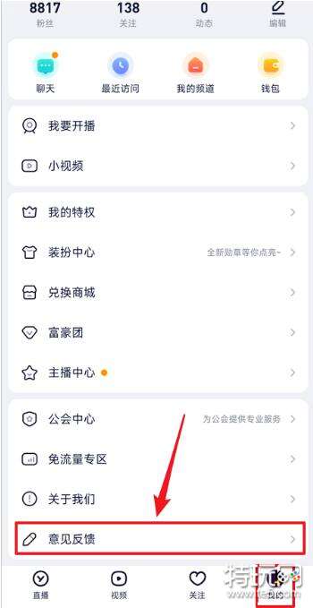 2、然后在YY【我的】界面,找到【意见反馈】项并点击它。
