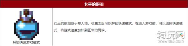 女巫的眼泪位于擎天塔,收集之后可以解锁快速模式,在进入游戏前,可以选择快速模式,将游戏速度加快到正常的两倍。