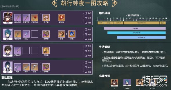 1、在胡行钟基础上加入夜兰,可以使行夜互相充能,提高副c输出能力,利用双水共鸣效果提高胡夜伤害;
