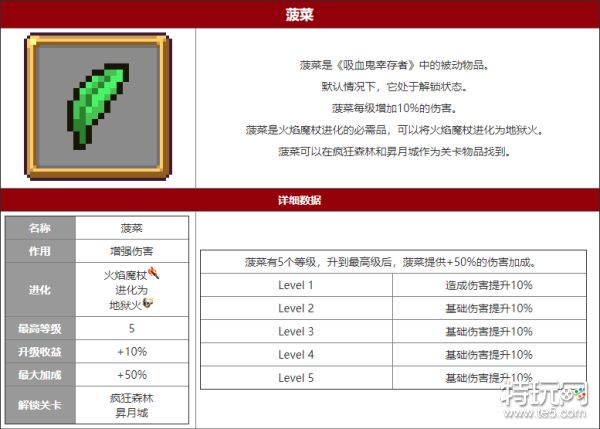 吸血鬼幸存者菠菜有什么用?吸血鬼幸存者菠菜可以在疯狂森林和昇月城作为关卡物品找到,是火焰魔杖进化的必需品,可以将火焰魔杖进化为地狱火,下面就是小编带来的吸血鬼幸存者菠菜详细数据一览,快来看看吧!
