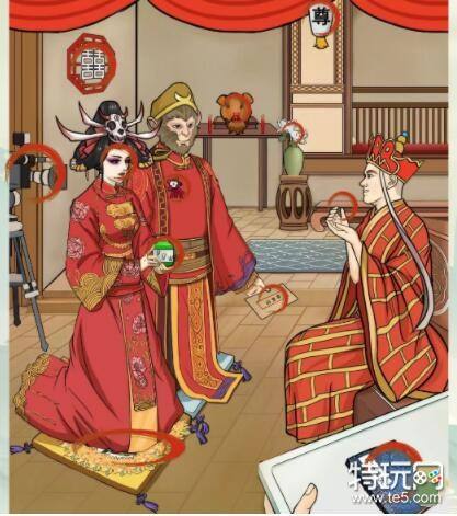 1、大圣娶亲不和谐之处是:白灯笼、白色囍字、摄像机、ddw、辞职信、孙子兵法、照妖镜、白菊花、猪八戒、胸花、菊花垫、白骨精(拖动照妖镜)
