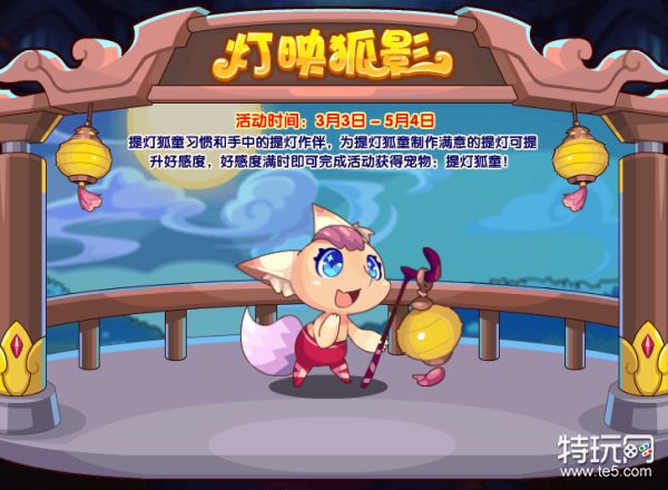 提灯狐童习惯和手中的提灯作伴,为提灯狐童制作满意的提灯可提升好感度,好感度满时即可完成活动获得宠物:提灯狐童!