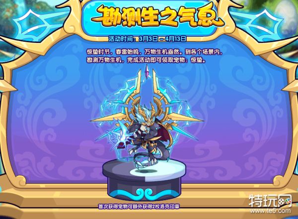 惊蛰时节,春雷始鸣,万物生机盎然。到各个场景内,勘测万物生机,完成活动即可领取宠物:惊蛰。