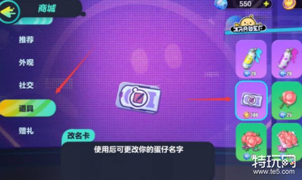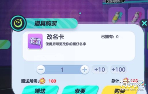 然后点击【道具】,这样就能看到改名卡了,使用改名卡即可修改昵称。可以选择购买或者索要,购买需要花费180个蛋仔币,购买之后也可以选择赠送。
