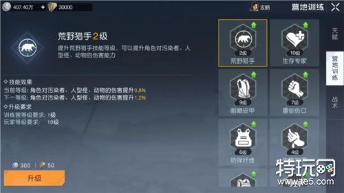 然后,生存专家也要优先点满,这个技能是加角色血量上限的。其次,耐磨皮甲、防弹纤维、沉稳防卫、强化头盔以及武器防御也是必点的,这些技能会影响角色防御。至于其他技能则可以放到后期再点满。