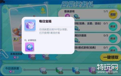 相信大家都知道,在游戏中,完成每日任务后,活跃度就会达到150点,然后大家就可以获得一个每日宝箱,在每日宝箱中,大家可以开出5个潮流纤维。