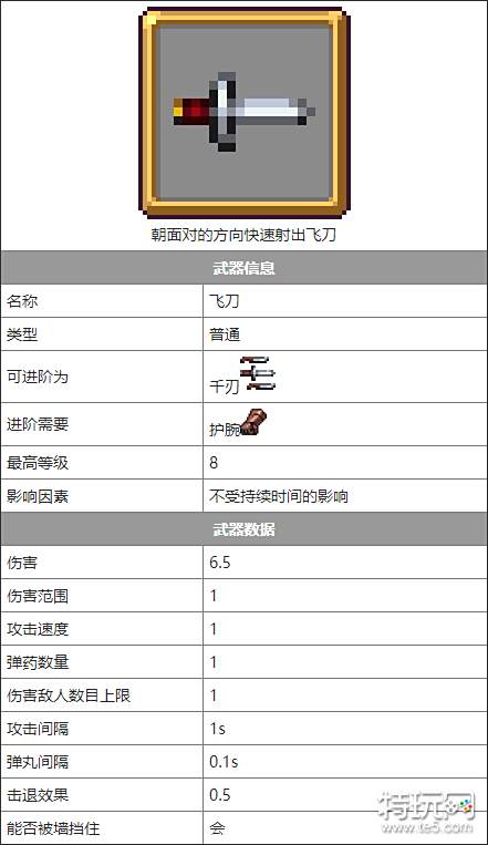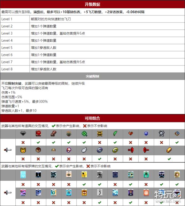 飞刀有8个等级。升满后飞刀有+10基础伤害,+5飞刀数量,+2穿透效果,-0.06秒间隔。