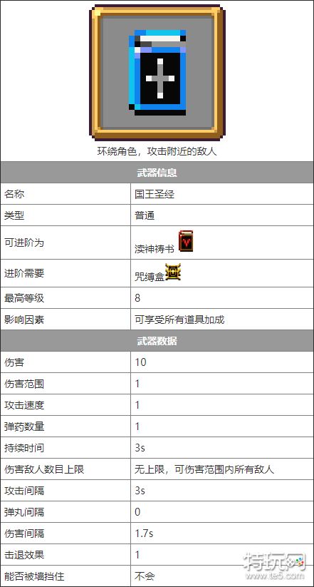国王圣经在玩家周围围绕一圈圣经,圣经顺时针旋转,对接触的任何敌人造成伤害。