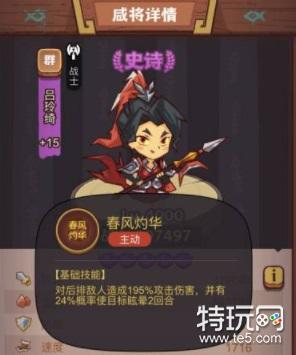 吕玲绮,定位为史诗品质的战士,最主要的技能是春风灼华,对后排造成195%攻击伤害,并有24%概率使目标眩晕2回合。