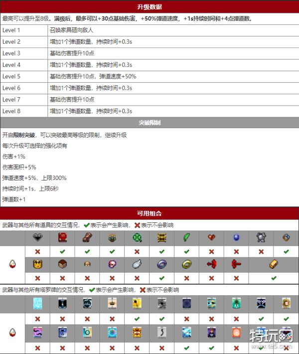 圣徒精华从屏幕上方掉落各种乱七八糟的家具,砸到敌人造成伤害,可以在敌人之间反弹,家具根据重力向下落,落到屏幕外面或者持续时间结束后消失。
