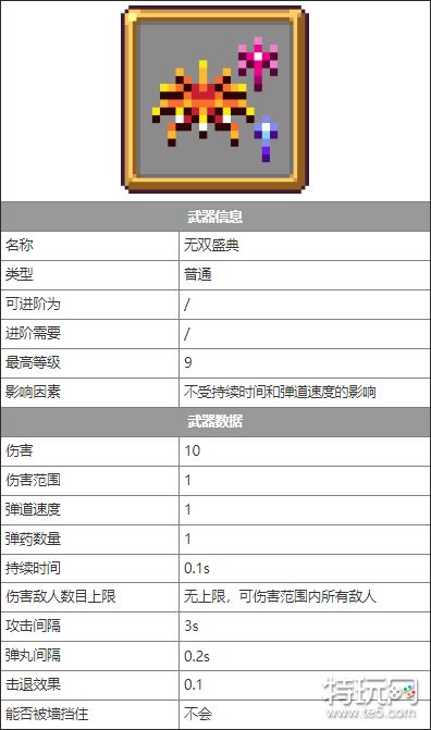 吸血鬼幸存者武器无双盛典怎么样?吸血鬼幸存者武器无双盛典能在角色周围创造很多可破坏的火把,可以造成范围的伤害,下面就是小编带来的吸血鬼幸存者武器无双盛典属性一览,感兴趣的玩家快来看看吧!