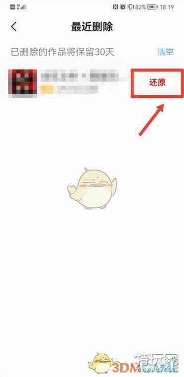 3、进入到最近删除页面之后即可查看删除作品,可进行【还原】操作。